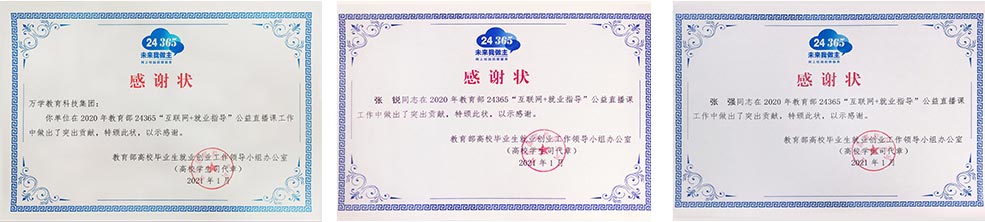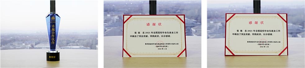 2021年,万学在高校毕业生就业工作方面贡献卓越,获教育部颁发“卓越合作伙伴”荣誉奖杯,并为虎扑体育董事长张锐、执行总裁张强颁发感谢状。
